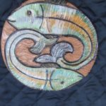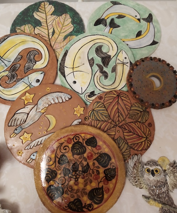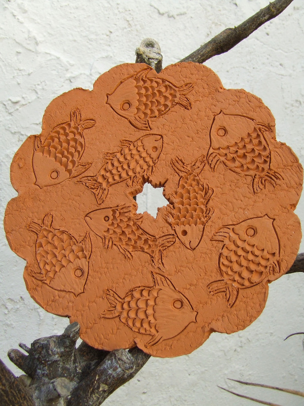 La tecnica: una sfoglia piuttosto spessa pareggiata a mattarello, una forma semplice ( ne ho fatte di più elaborate e mi si sono miseramente rotte in cottura), un decoro seguendo la fantasia del momento. Ulteriore lavorazione: qualche incisione, anche passante ma che non infici la solidità del lavoro. Divertente anche qualche parte engobbiata ( vedi, se vuoi articolo sull’engobbio) : giunti a durezza cuoio si stende a pennello sulle parti prescelte una barbottina ( densità tipo crema pasticcera) anche colorata ( con colori sotto smalto). A barbottina asciutta ma non secca, si può provare a levigare il decoro con una pietra o altro ( ho usato una conchiglia) come già si faceva nel Neolitico : allora per impermeabilizzare, io solo per lucidare un po’ visto che gli oggetti non verranno invetriati ma cotti una sola volta a gran fuoco . Prima della cottura si lascia naturalmente asciugare a lungo girando spesso gli oggetti perché non si imbarchino. Il gioco è fatto! Semplice, di grande soddisfazione e molto rilassante.