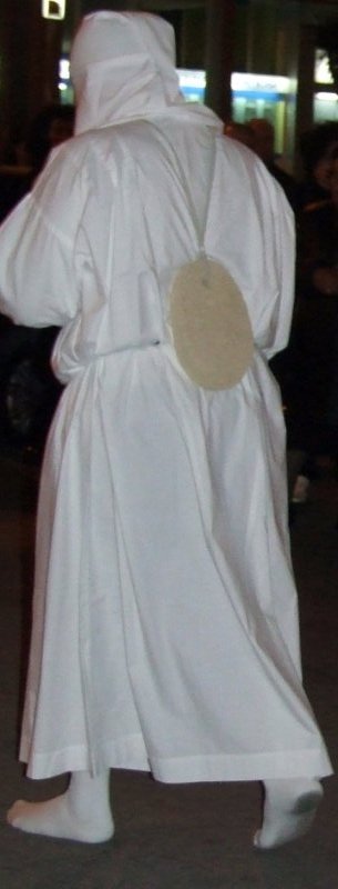 Il troccolante della confraternita del SS. Crocifisso in saio e cappuccio rosso. mozzetta celeste, con il disarmonico battito della troccola da inizio alla sacra rappresentazione. Egli porta sul capo, in questa occasione, come i suoi confratelli, una corona di asparagio selvatico.