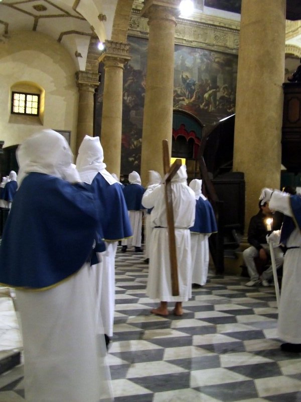 I confratelli vestiti di saio, cappuccio e mozzetta incedono processionalmente, distanziati, a passo lento e cadenzato, per le viuzze antiche che odorano di incenso, di cibo, di vento, di mare.