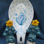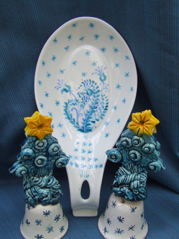 Ho inventato anche, per regalare agli amici, delle ciotole per biscotti e frutta secca , lavorate contemporaneamente in terra bianca e rossa , che sembrano anch’esse da mangiare : terra rossa e bianca come biscotto e glassa di zucchero! Poi, piccole idee per la tavola, per l’albero, per la casa: ghirlande, addobbi, stelle, alberelli, campanelle, ciotoline porta candele, sottopentola e poggiamestoli per le amiche affacendate in cucina e segnaposto per le tavole delle feste.