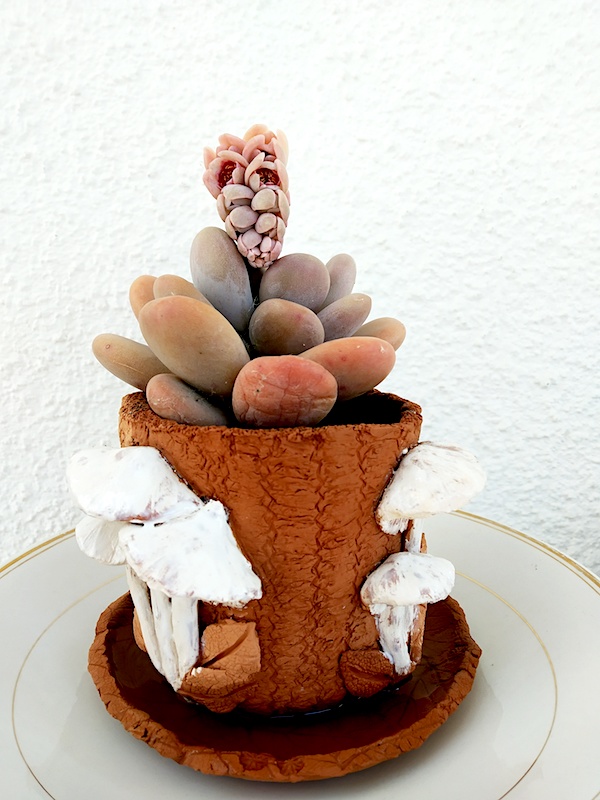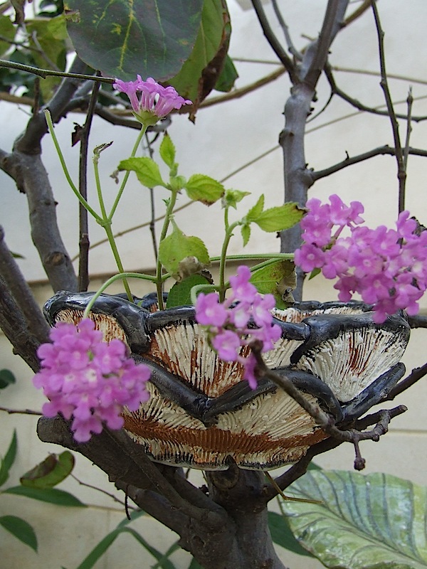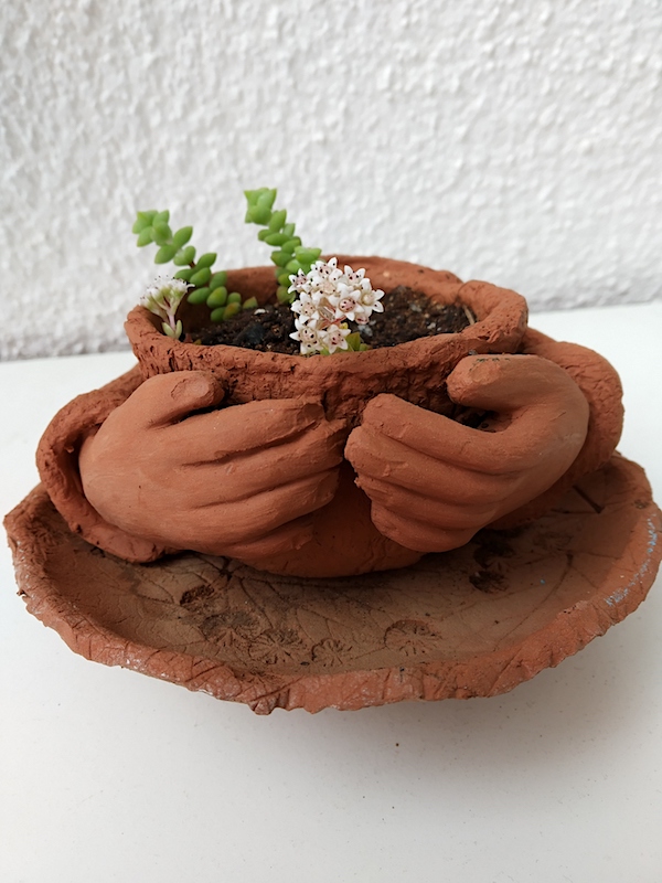 Ho modellato vasi di terracotta per i rinvasi di primavera. Ad ogni pianticella il suo vaso, modellato su misura, secondo la sua personalità e le sue esigenze come fa la sarta per la sua cliente. La piantina grassa folta e sostenuta che può simulare capelli punk in un vaso dal viso sbigottito ( per l’acconciatura che si ritrova!). Alle piccole violacciocche che da gennaio fioriscono ovunque il vento porti un pugno di terra una ciotola larga per le loro radici finissime e superficiali con un po’ di sabbia. Ciotole grandi invece alle globose e spinose Echinopsis che in estate ci regaleranno stupendi fiori rosa molto più grandi della pianta stessa che dureranno un sol giorno ma capaci di incantare. Grandi vasi di terracotta per le salvie che si preparano a fiorire. E così via, sbizzarrendomi in forme che si potrebbero definire “classiche” ed altre molto estrose. Funghi e lumache, ciotole con impronte di foglie poi ricoperte di smalti multicolori e sottoposte ad un II° fuoco.