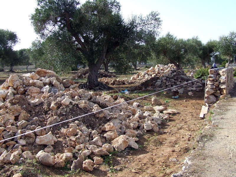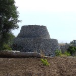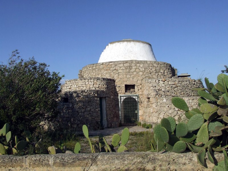 Su tutti questi tesori nascosti dominano, visibilissime, le antiche costruzioni rurali. Queste costruzioni tronco coniche in pietra a secco sono un fenomeno estesissimo intorno al Mediterraneo e qui prendono il nome di “caseddhi” “caseddhe” o “pajare”. In Liguria si chiamano “casélle”. Sono rifugi legati alla vita contadina, in pietra a secco, in genere di un solo ambiente, costruite con il principio delle mensole aggettanti che permettono di andare chiudendo verso l’alto formando una pseudo cupola. Quello che caratterizza e distingue le costruzioni salentine è la bella scala esterna per raggiungere la cupola: funzionale alla costruzione (cresce con essa), alle riparazioni e all’essiccazione dei raccolti. Queste costruzioni dalle profondissime mura (solo ed esclusivamente di pietra) sono il frutto delle conoscenze stratificate di innumerevoli generazioni. Un cordone di pietre che circonda il Mediterraneo e lega le architetture di Pantelleria, quelle sarde e liguri, le strutture funerarie a tholos della Grecia classica sù sù fino ai ripari mesopotamici de III millenio a.C. con una struttura quasi immutata. Tecnica costruttiva immutata nel tempo presentano anche i muri a secco. Ovunque si scava il più possibile per ancorarsi alla roccia sottostante e si installa una specie di fondamenta: la scarpa. Poi si inizia ad alzare, con pietre grosse, scelte con cura, una ad una, perché si incastrino al meglio tra loro e con il terreno. Piano piano si va sù, in due file parallele,con l’unica guida di due cordicelle annodate a paletti che si innalzano con l’innalzarsi del muro. Lo spazio interno della cassa così formata si riempe con il pietrame ricavato dalla pulitura del terreno. Con la stessa tecnica si realizzano anche forni per la cottura del pane, l’essicazione dei fichi, dei pomodori e degli altri prodotti del fondo.