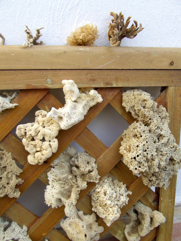 E,nelle calette, nei luoghi più riparati, tra l’erba, il vento ammucchia le spugne che, asciugate dal sole, diventano lievi come piume. Sono una trina dorata tra tanta spazzatura. Sulle spiagge joniche del Salento direi di averne visto più di una trentina di tipi. Appartengono alla famiglia dei poriferi e in gran parte si sbriciolano al sole. Sono scheletri, gli scheletri esterni di simpatici animaletti a forma di fiaschetto che vivono in colonie ad una profondità che va dai 20 ai 60 metri. Il mare ha già ripulito queste forme aggraziate dalla membrana esterna ( la pelle che le ricopriva) di cui a volte persistono residui ( che le fanno sembrare sporche di catrame). Sono poriferi dallo scheletro fibroso ed elastico, animaletti marini che da larve migrano verso nuovi insediamenti ma da adulti si installano su rocce e fondali dove assorbono, filtrano ed espellono acqua marina trattenendo ossigeno e cibo per le loro funzioni vitali. Da alcune varietà l’uomo, fin dalla antichità classica, ha tratto vantaggio. Già i greci le usavano per imbottire gli elmi ed attutire i colpi e sono citate nell’Iliade e nell’Odissea. Aristotele ne riconobbe la natura animale. Contenendo una buona percentuale di iodio ( che si sprigiona per arrostimento), nella medicina medioevale furono usate per combattere il gozzo. Fu segno di raffinatezza, nel Rinascimento, usarle per lavarsi. Pochissime le varietà atte a questo scopo. Nel Mediterraneo e nello Jonio in particolare, vive la spongia officinalis var.mollissima comunemente chiamata fine dama: elastica.morbida, assorbente.